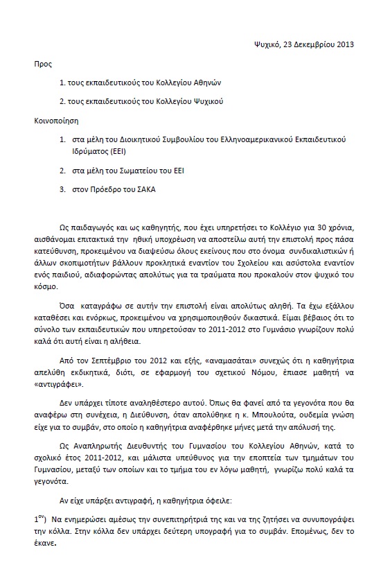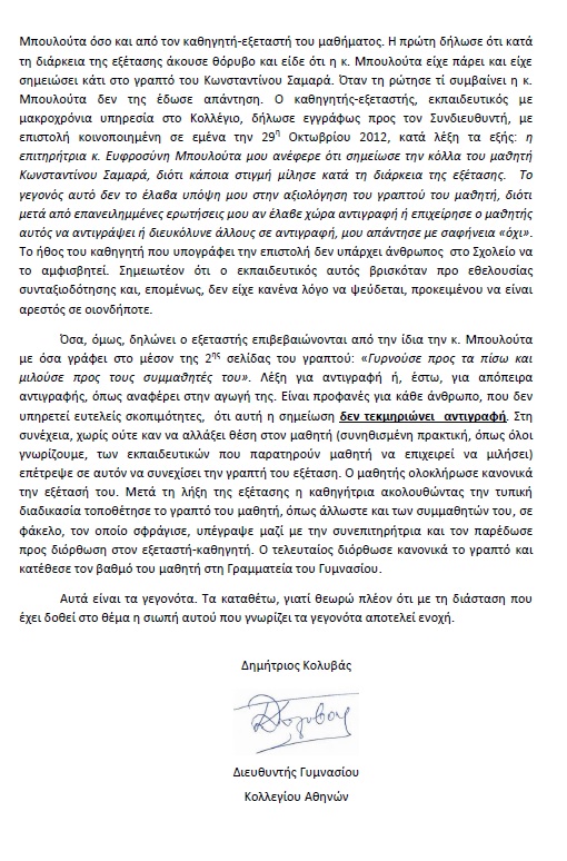 Επιστολή Διευθυντή Γυμνασίου Κολλεγίου Αθηνών Δ. Κολυβά